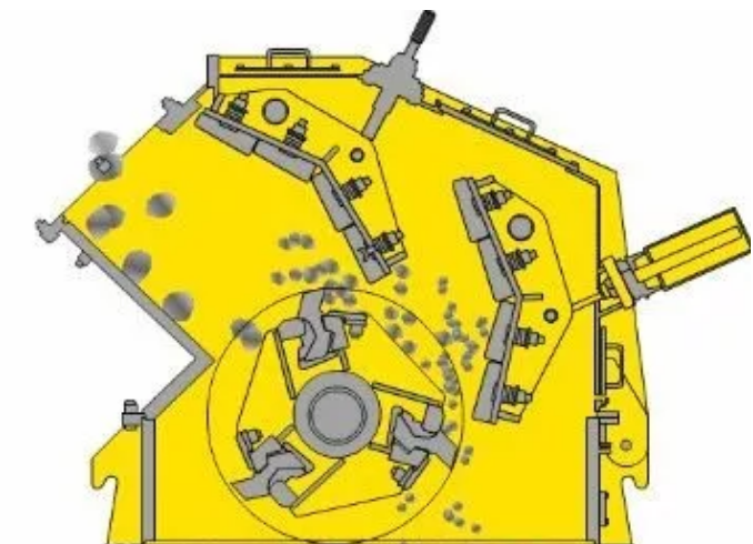 反擊式破碎機可通過(guò)多種方式調節出料粒度,如調節轉子速度、調節反擊板和研磨腔的間隙等。間隙調節可通過(guò)機械式或液壓式進(jìn)行調節,采用液壓調節系統可方便地通過(guò)就地操作按鈕或運程控制系統完成間隙的調整。